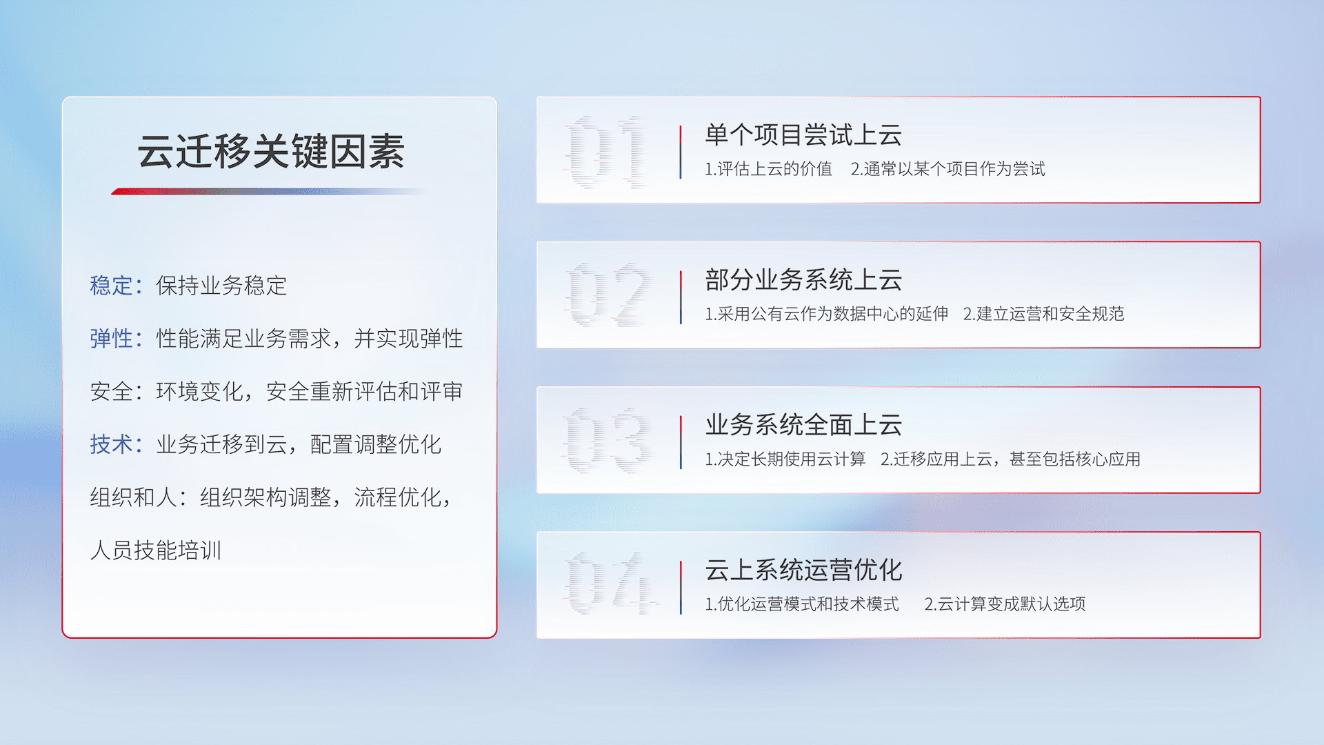 结合实际业务,,,,从规划设计、、、云平台选型、、、、云原生改造、、、、数据迁移、、集成交付,,,迁移全过程为客户识别最佳上云路径,,做好风险识别管理,,,,设计网络架构、、身份权限、、安全审计合规、、、操作审计、、、日志审计、、、监控告警策略、、多站点容灾设计等,,,对云上基础设施进行整体规划,,,提升IT治理水平,,,以满足弹性、、、、高可用、、、高性能的需求。。