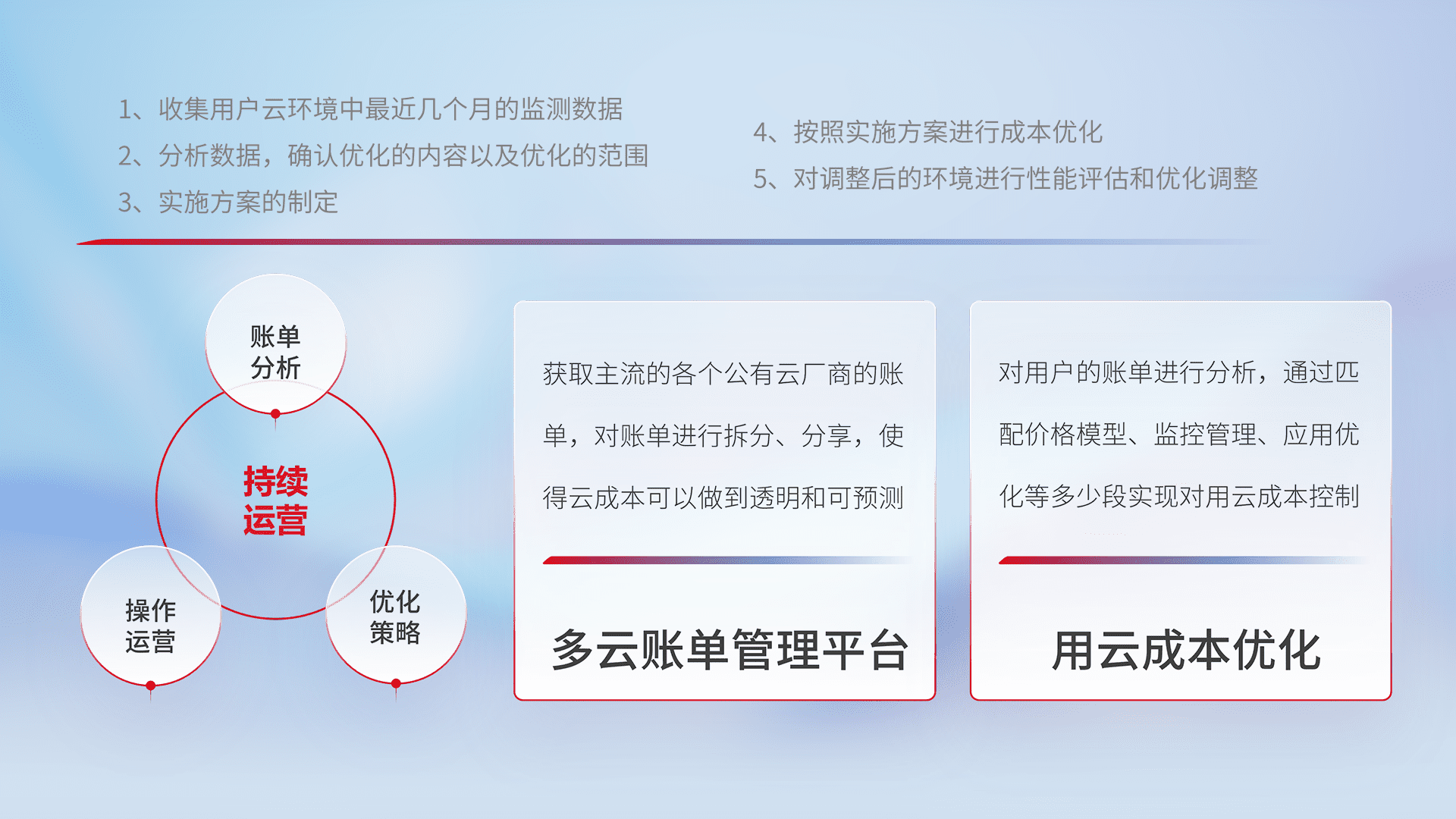 通过多云纳管,,,以统一的资源数据模型把客户的云资源进行抽象和封装,,,进而实现对多云资源的统一操作,,,保障云资源管理的可靠性、、稳定性与可用性。。。量身定制化运维内容,,,,配置、、、、开发运维、、、补丁管理、、、、备份、、、、监控、、认证和访问管理、、审计和日常巡检等,,保障在用云过程中的可靠度,,,稳定度以及高可用率。。。。